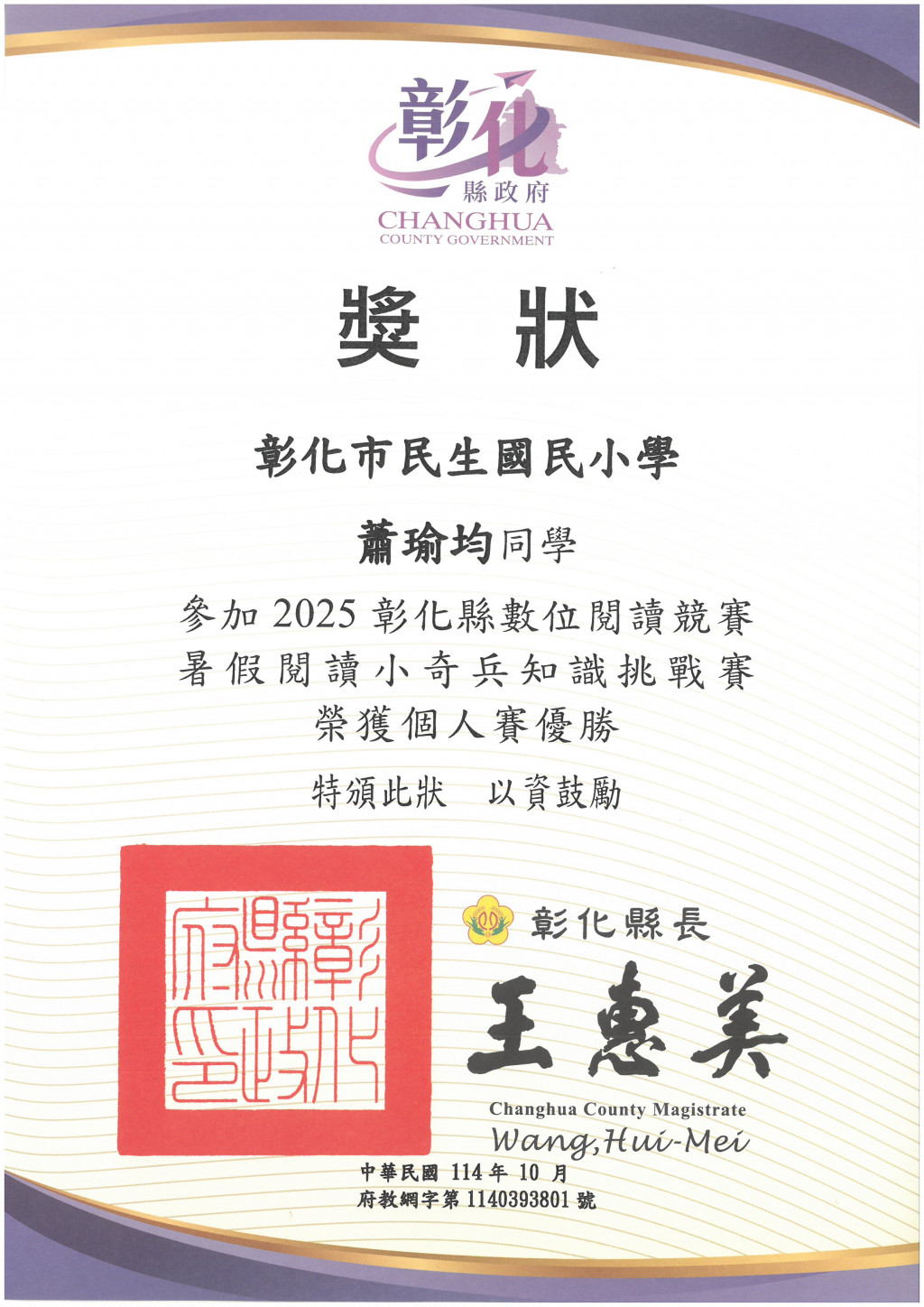 2025彰化縣數位閱讀競賽-暑假閱讀小奇兵知識挑戰賽403雲品豪、502蕭瑜均榮獲個人賽優勝