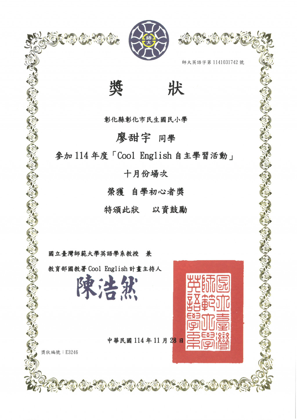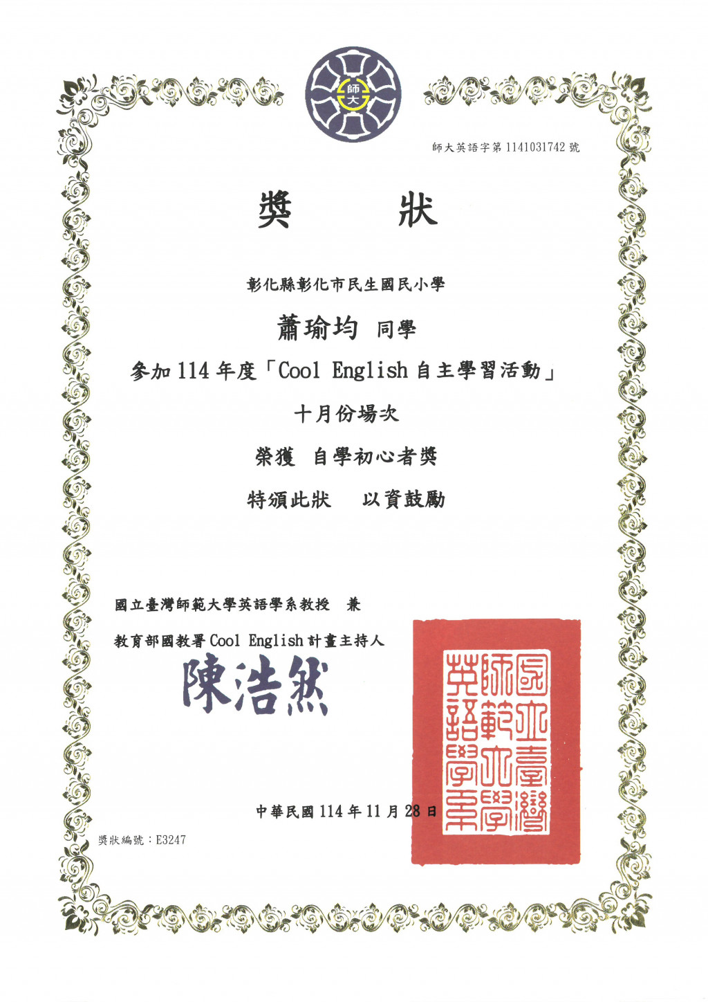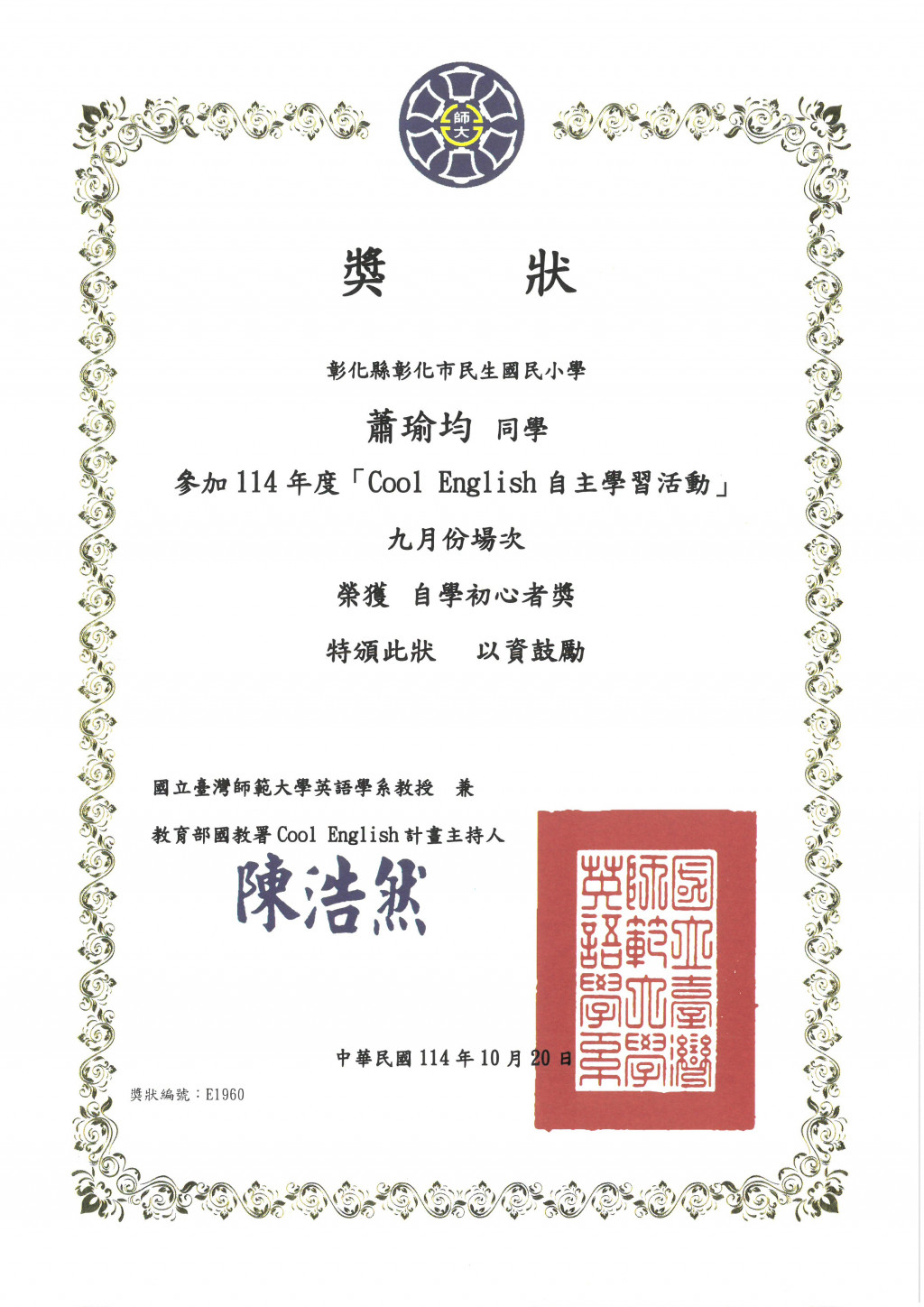 502蕭瑜均榮獲九、十月份場次自學初心者獎