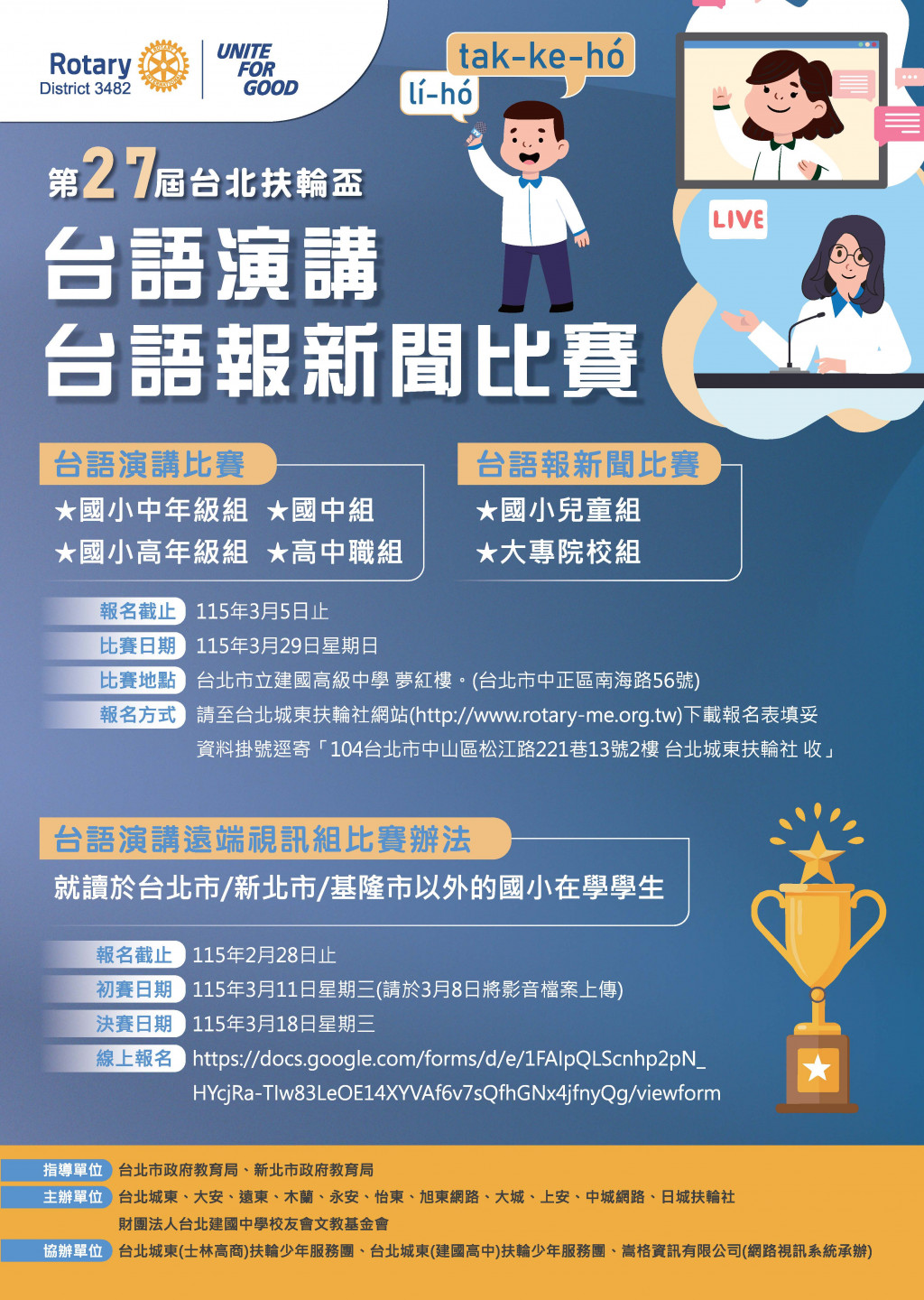 台北城東扶輪社辦理「第二十七屆台北扶輪盃台語演講遠端視訊組比賽」活動辦法、報名表及海報各1份,請鼓勵貴校國小學生踴躍辦名參加