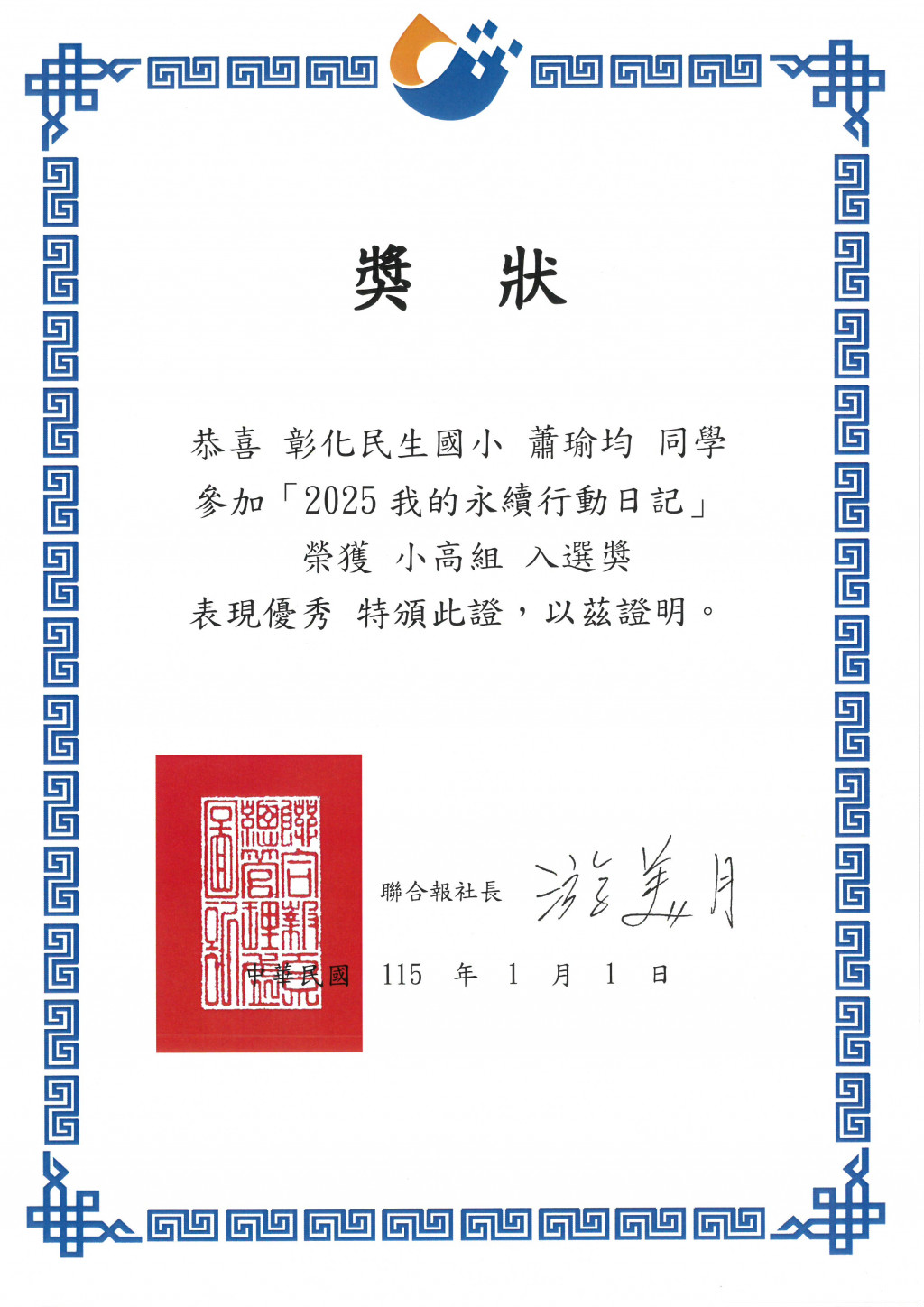 蕭瑜均參加聯合報「2025我的永續行動日記」徵件競賽榮獲 小高組入選獎