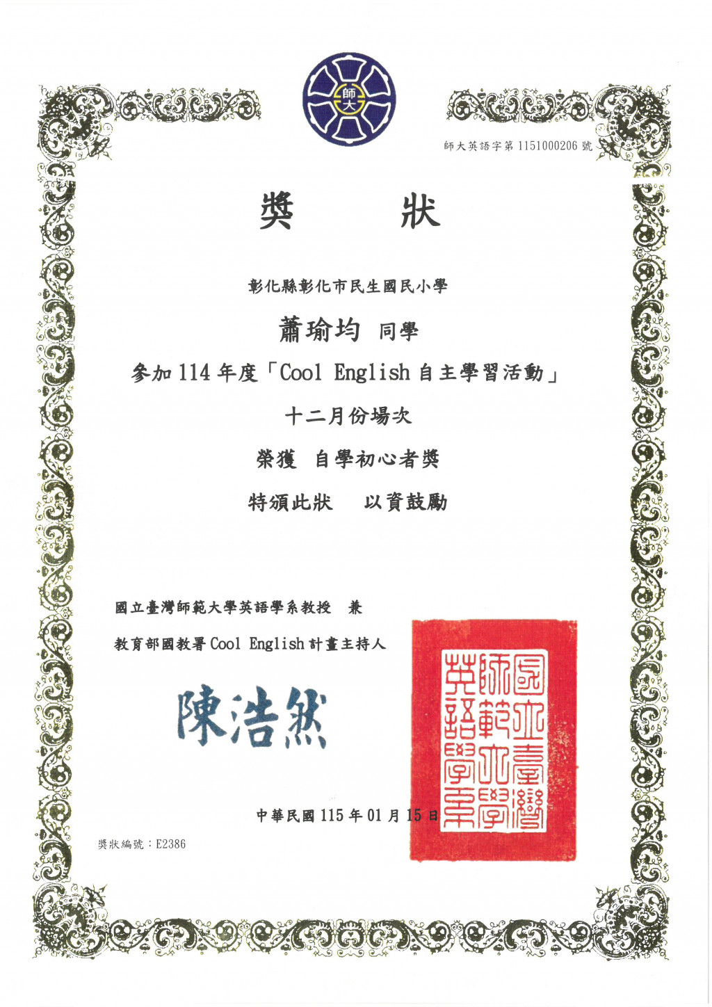 114年度「Cool English自主學習活動」 502蕭瑜均榮獲十二月份場次自學初心者獎