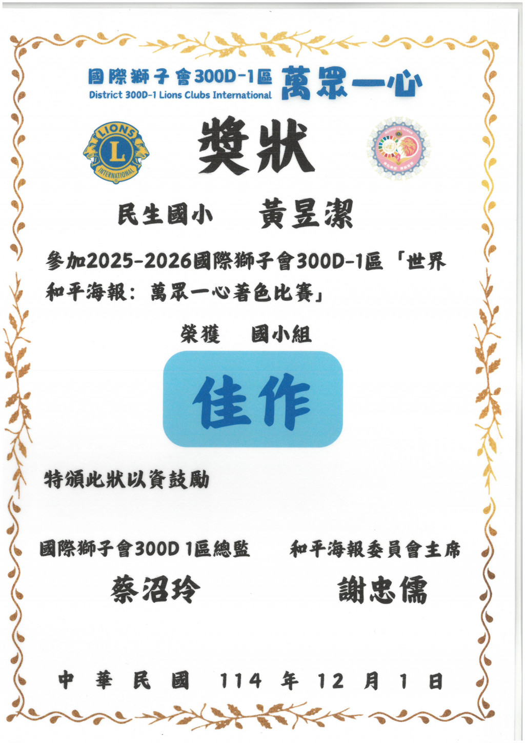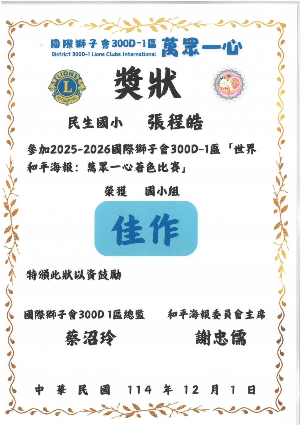 2025-2026國際獅子會「世界和平海報:萬眾一心著色比賽」